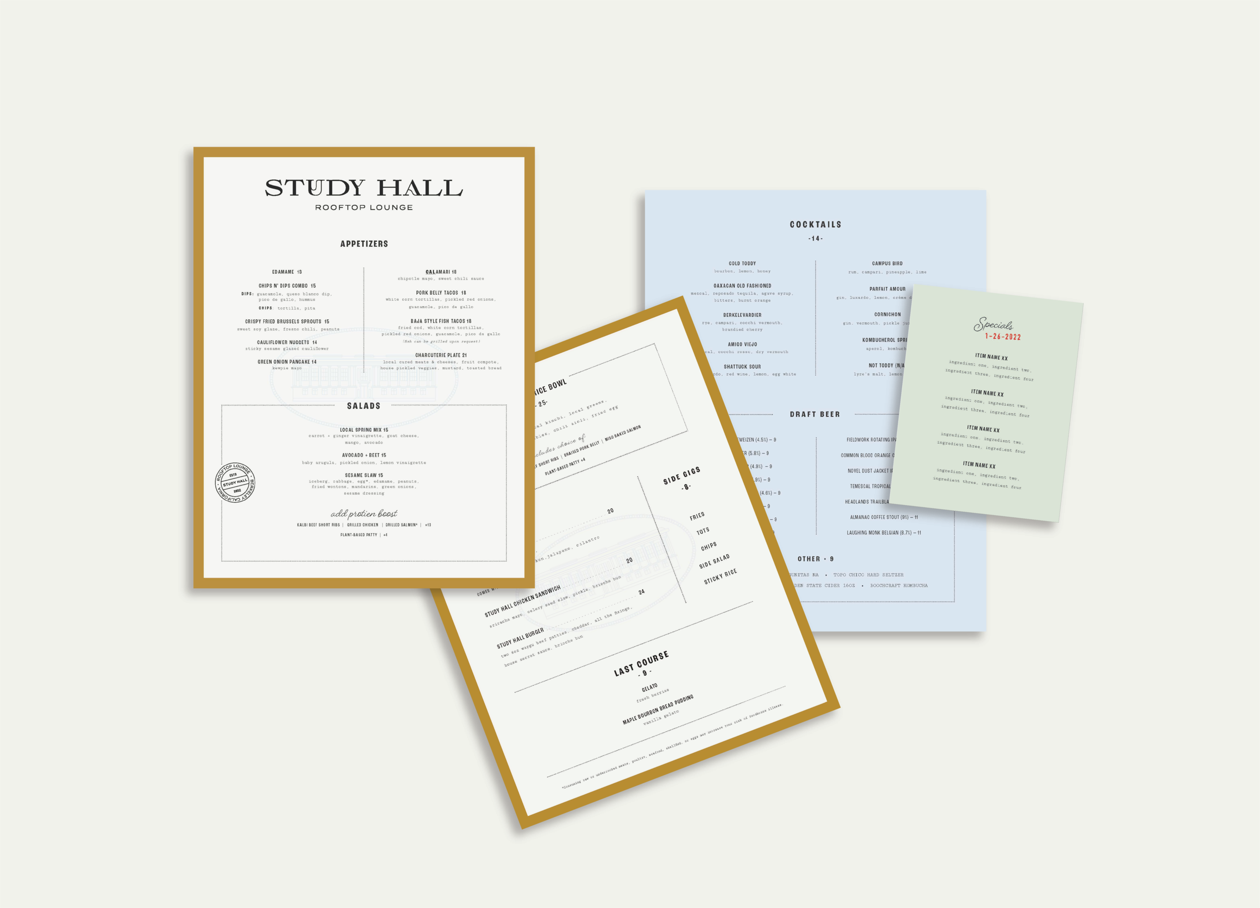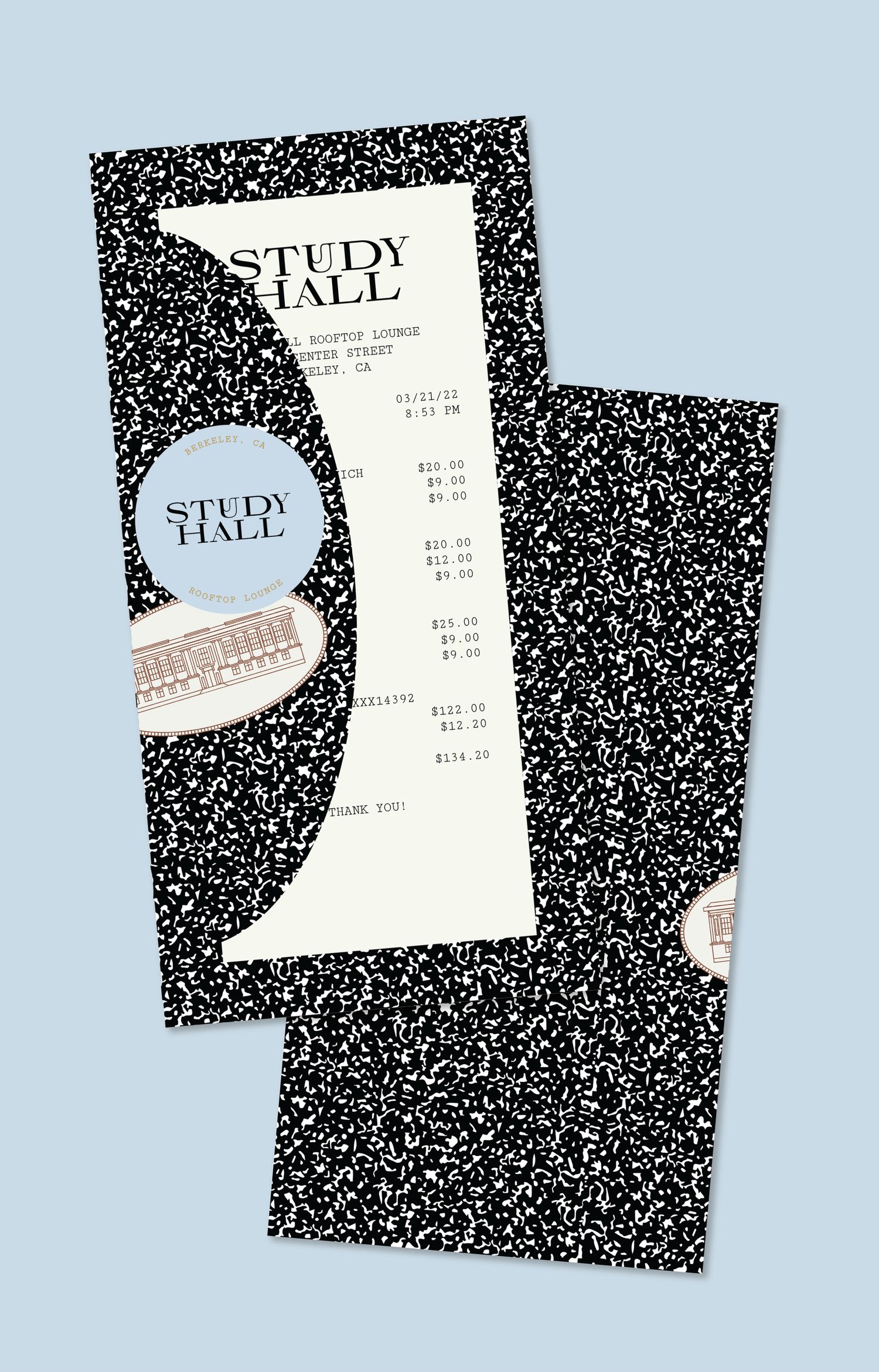 To launch Study Hall, the rooftop lounge at Berkeley's Residence Inn, our team at Carbonate developed a brand identity that would appeal to both local students and visiting parents. The challenge was to capture the free-thinking spirit of the UC Berkeley campus and surrounding area, while creating a brand that felt both inviting and playfully rebellious. We crafted a visual identity and supporting collateral that was cheeky, nostalgic, and unconventional. The resulting identity and collateral communicated a charming disregard for convention, successfully establishing Study Hall as a unique campus destination.